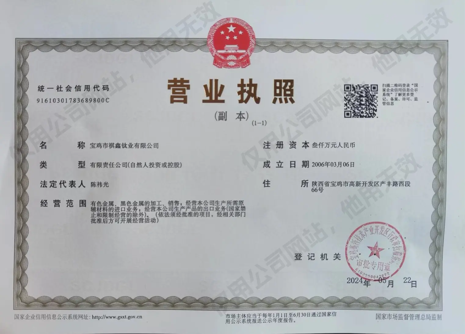 宝鸡市祺鑫钛业有限公司成立于2006 年,是一家从事电化学工业钛电极、民用钛材料的民营企业。